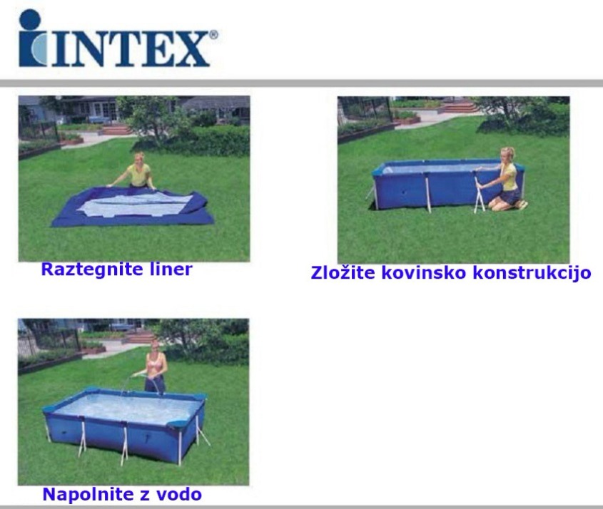 Pomembno je, da bazena Intex ne postavite neposredno na tla oziroma travo, ampak na zaščitno podlogo. Vsi bazeni morajo biti postavljeni na popolnoma ravno površino.