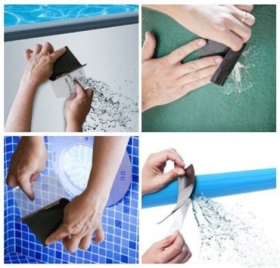 Enostaven za rezanje na želeno velikost. Za popravilo vseh vrst bazenskih folij PE, PVC ali drugih podobnih materialov. Uporabi se lahko tudi na kovinskih izdelkih, steklu in na gumiranih površinah.
