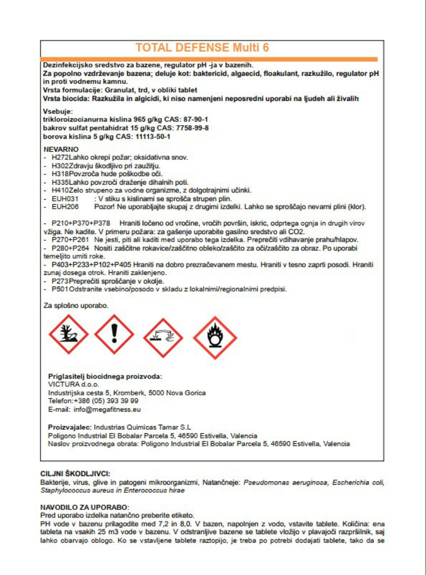TOTAL DEFENSE Klor Granulat je bistvenega pomena v primeru vode, ki začne dobivati zelenkaste odtenke. Na stenah bazena se lahko tvorijo obloge mikro alg.