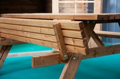 Vzdržljivi in masivni set klopi in mize. Klopi se po potrebi prevzdignejo, da zavzamejo manj prostora.