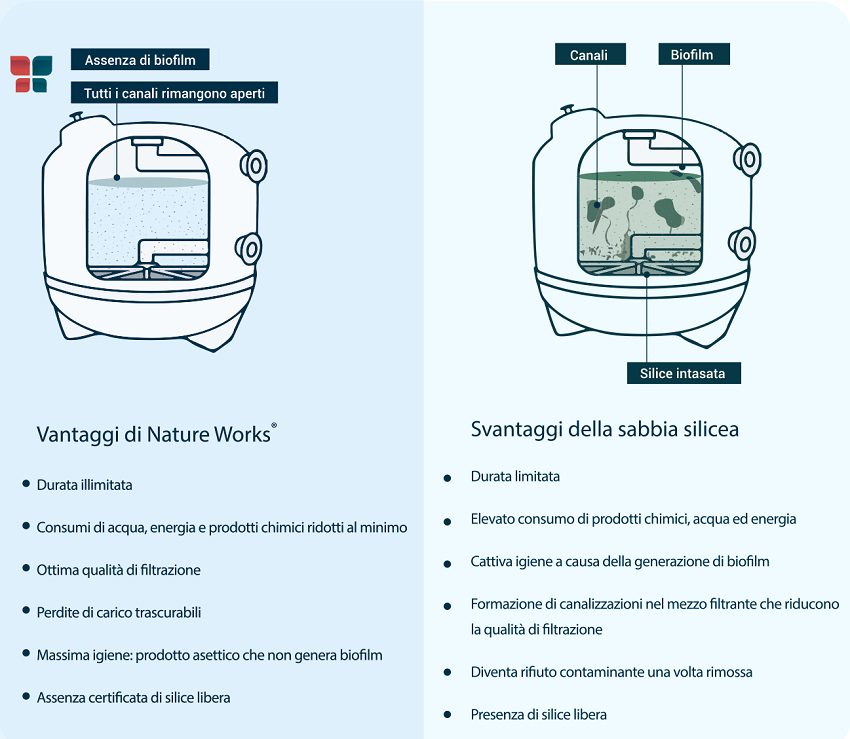 NATURE WORKS je izdelan iz visoko čistega recikliranega aktivnega stekla (Virgin Active Glass), katerega raven kakovosti je potrdila organizacija Bureau Veritas in znaša najmanj 99,999 %. Primeren je za vse vrste peščenih filtrov, tako za zasebne kot za občinske ali javne bazene.