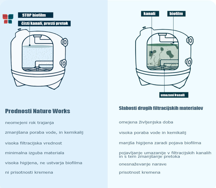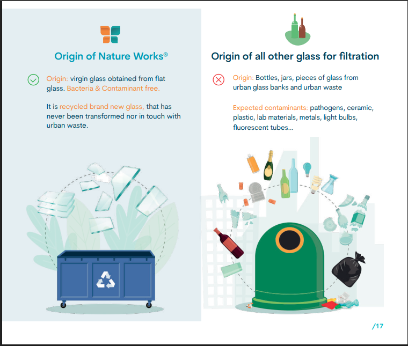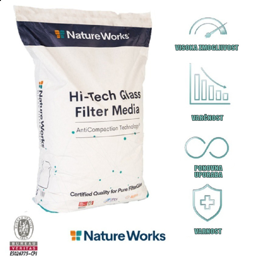 Stekleni filtrirni medij Nature Works, je izdelan izključno iz čistega stekla brez onesnaževalcev, zaradi česar je edini izdelek, ki v celoti izpolnjuje visoke standarde kakovosti in varnosti, ki jih določa standard NSF/ANSI/CAN 61, najzahtevnejši na področju filtracije vode za prehrano ljudi.