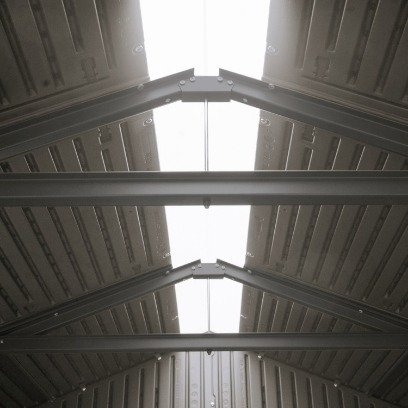 Hiša iz polietilena visoke gostote (HDPE) z dvojnimi stenami. Siva barva z vzorcem pravega lesa, grobo brušen zaključek. Streha je izdelana iz jeklenih palic in opremljena s strešnim oknom po celotni dolžini. Vrata, ojačana z jeklenimi komponentami; zapiranje z zapahom.